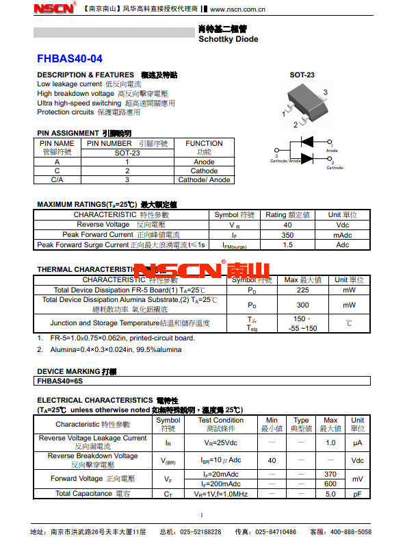 FHBAS40-04二極管參數:反向電壓40V,正向峰值電流350mA,正向最大浪涌電路1.5A。總耗散功率300mw