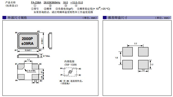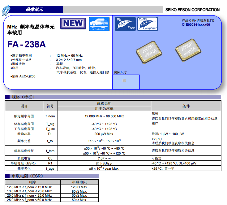 FA-238A是愛普生無源晶振中少有的一款3225車載晶振,行業內人都知道FA-238A又稱之為汽車級晶振或者車規晶振。那么這是為什么呢?因為在汽車導航系統的電路設計中,印刷電路板的尺寸通常較小,需要較長的時間、高效率和穩定的工作。因此,采用高穩定性、小型化的晶振具有重要意義,而FA-238A符合AEC-Q200標準,在抗震性、耐高溫等方面可靠性更好,包裝尺寸僅為3.2×2.5×0.7mm,穩定性高,功耗低,是車載設備的最佳選擇,今天就給大家來介紹此款汽車晶振系列的兩種常用規格——FA-238A之22.579200MHZ,X1E000341002800,FA-238A之20MHz,X1E000341003100。先看下規格書如下圖所示