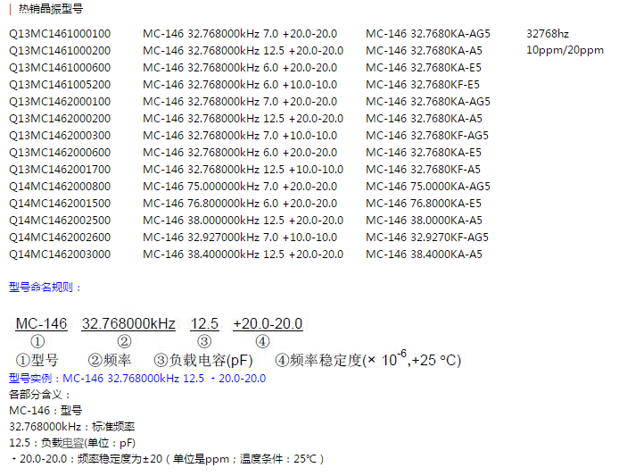 MC-146晶振,愛普生晶振,32.768KHZ千赫子時鐘晶體,其本身主要應用在時鐘控制產品,或者是控制模塊,主要給時鐘芯片提供一個基準信號,MC-146具有優良的耐熱性,耐環境特性,可發揮晶振優良的電氣特性,MC-146規格上具有較小的尺寸和串聯電阻,基于EPSON高端QMEMS技術,使晶振性能穩定可靠,適用于各類對品質要求較高的小型電子設備中如消費類設備,無線電設備,血壓計,血糖監測儀和安全系統應用中的應用處理器,南山半導體為您精心整理出MC-146規格,參數。熱銷型號如下圖所示: