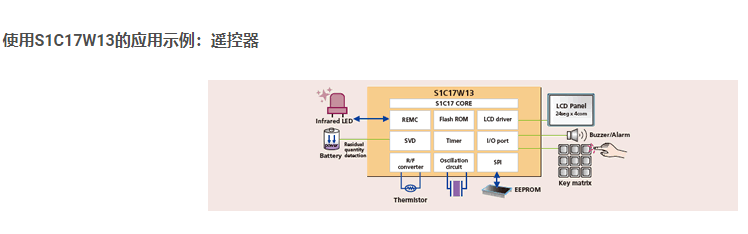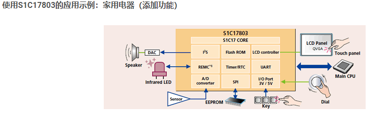 16位微處理器之S1C17800系列:該系列可以在最高48MHz的頻率下實現與32位微控制器類似的高級處理。它集成了LCD控制器,USB,A / D轉換器和各種I / F,例如SPI,I2C等。它適用于