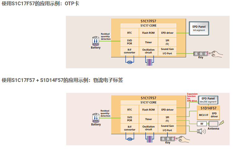 使用S1C17F57的應用示例:OTP卡,使用S1C17F57 + S1D14F57的應用示例:物流電子標簽。