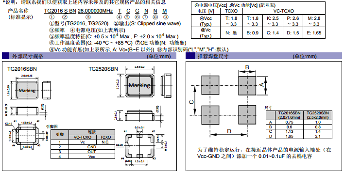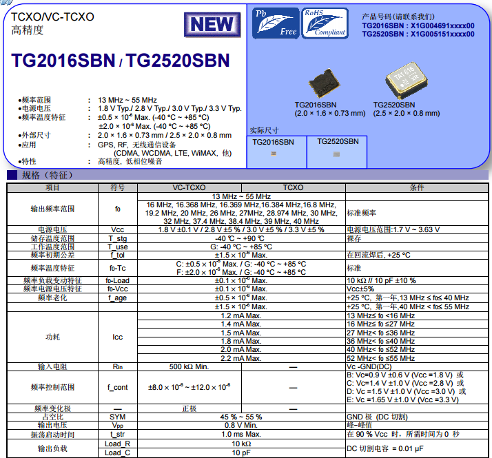 TG2016SBN,38.4MHz滿足市場對于小型化的需求.并且提供電源電壓1.8V-3.3V,低消耗電流。X1G004691013600,38.4MHz此款2016溫補晶振儲存溫度在-40°C to +90°C,工作溫度范圍在-40°C to +85°C。振蕩啟動時間只需1.0 ms Max.即可實現。X1G004691013600這種低電壓、高精度TG2016SBN溫補晶體振蕩器是小型化高端智能產品的福音,在市場上廣受歡迎。淡然除了TG2016SBN X1G004691013600 還有很多其他頻點很受歡迎:16MHz , 16.384MHz,19.2MHz,20MHz , 26MHz , 27MHz , 28.974MHz , 30MHz , 32MHz , 37.4MHz , 39MHz , 40MHz,頻率變化為正極。下面南山電子就給大家提供TG2016SBN的規格書以供大家選型參考