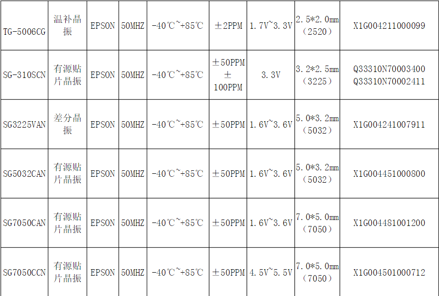 晶振50m是應用比較廣泛的一種頻率,其實常用的50m晶振大部分是50m有源晶振,可以用于銀行金融系統,稅控系統,遠程抄表系統,加密狗,測試儀器,超聲頻,網絡傳輸ADSL,安防(攝像頭,報警器)等,當然熱門的還有比如溫補類型50m晶振TG5006CG 50MHz,南山電子愛普生晶振官方授權中國地區核心代理商,實現了小批量,快速交付的客戶需求。還是老規矩,我們深信客戶的體驗度是首要標準,在這里繼續整理常用愛普生晶振50m的型號給大家選型參考: