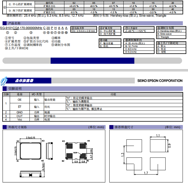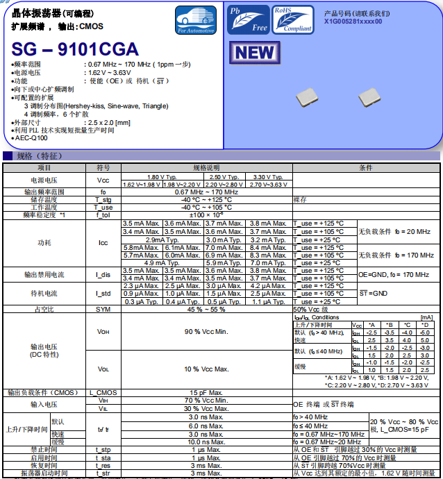 大家好,今天給大家介紹車規級晶振SG-9101CGA。首先SG-9101CGA屬于愛普生9101系列,是一款可編程晶振。SG-9101CGA車規級晶振采用2.5x2.0mm封裝,利用PLL技術生產,此款振蕩器的頻率范圍從0.67M~170MHZ任一頻點可選,步進1ppm,采用標準CMOS輸出,輸出負載為15pF,有良好的頻率穩定性。SG-9101CGA系列車規級晶振采用低供電電壓,范圍為1.62V~3.63V,且具有低功耗特性。在25℃,1.8V/2.5V/3.3V下,SG-9101CGA空載電流消耗典型值分別為4.9mA /5.9mA /7.0mA。過ST端口可實現待機模式,進一步降低設備的功率損耗。SG-9101CGA系列車規級晶振工作溫度范圍為-40℃~+125℃,無鉛,綠色環保,滿足汽車工業標準。另外,此款車規級晶振采用小尺寸貼片封裝,尺寸僅為2.5×2.0×0.7mm,能在對空間敏感的汽車電子應用中更加得心應手。SG-9101CGA功耗低至0.3μA,工作溫度高達125℃,符合RoHS要求和AEC-Q100標準,適合應用于汽車多媒體、車載導航系統和遙控鑰匙等車載電子設備。下面南山電子就給大家分享下車規級晶振SG-9101CGA的規格書以供大家選型推廣。