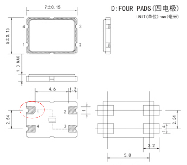 四腳有源晶振其實在實物圖上有一個絲印點,四腳有源晶振的腳位通常都會用點來區分。絲印點的所處的位置就是腳1,翻過來順著順時針數過來,腳位的方向就一清二楚了。如下圖: