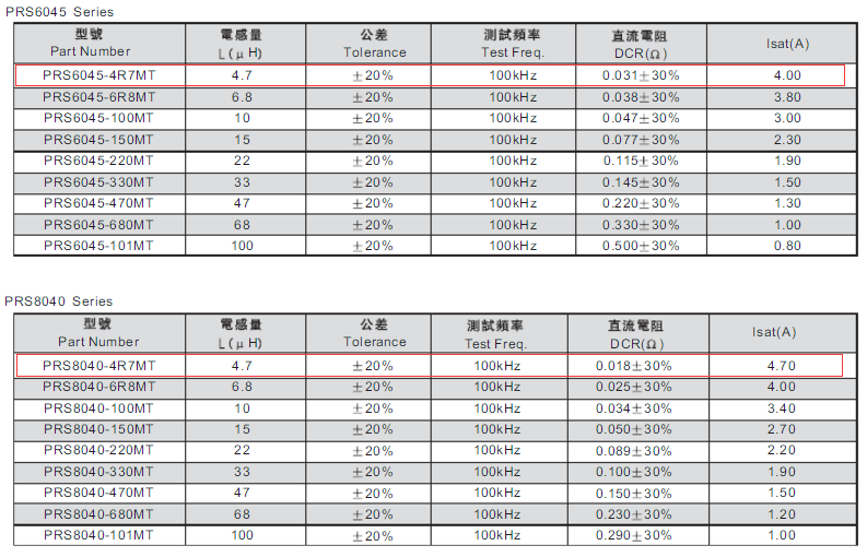 如上圖所示:同樣是4r7貼片電感,技術已經確認電路可以用將PRS8040 8x8mm可以換成6x6mm,那么在精度公差都是20%,測試頻率都是100khz情況下,那么問題就出在電流上,他們工作額定電流是4.1A,原來使用8040時 飽和電流是4.7A可以滿足工作電流通過,而現在換成6045尺寸的4r7電感,雖然尺寸上滿足,但是關鍵一點飽和電流4A,無法滿足工作電流,所以大家在選型過程中一定要當心,如果拿不準可以讓我們南山電子提供技術支持,當然除了上述4r7貼片電感之外,南山還提供風華各種系列共模電感,高頻電感,工字電感等
