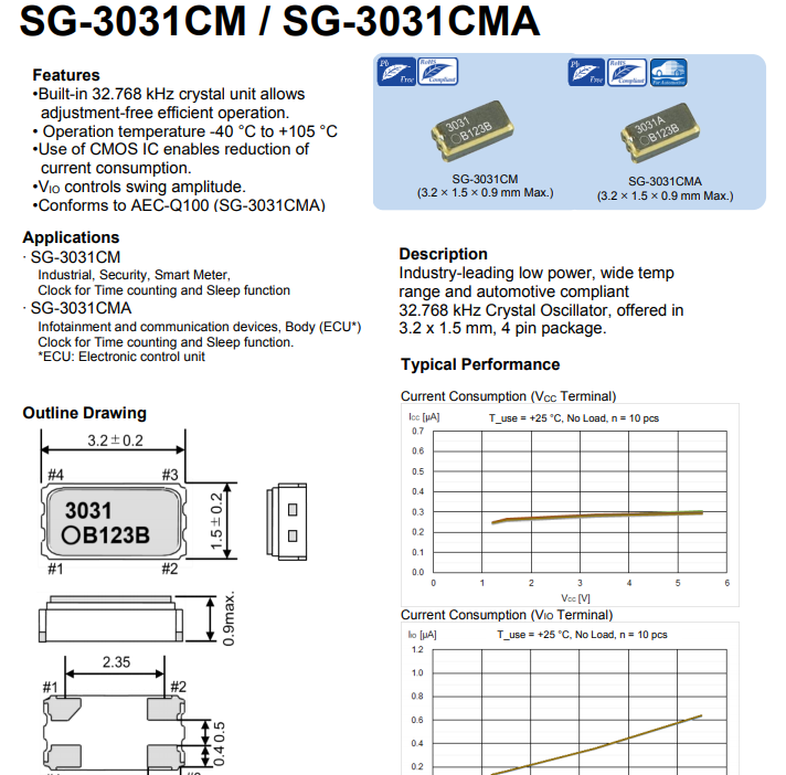 大家好,今天來給大家介紹一款低功耗,輸出頻率為32.768kHz的汽車用晶振SG-3031CMA。晶振SG-3031CMA的VIO PIN是CMOS接口,可用作OE PIN,可降低功耗。頻率為固定頻率32.768kHz,小尺寸3215封裝,大家都知道32.768kHz一般無源晶振較多,而SG-3031CMA等于是SG-3031CM的升級車規(guī)款,和SG-3030CM同屬于32.768K有源晶振,SG-3031CMA內(nèi)置的32.768 kHz晶體單元可實現(xiàn)無調(diào)整的高效運行。工作溫度-40°C至+105°C,使用CMOS IC可以減少電流消耗。接口電源電壓控制擺幅,符合AEC-Q100標準,是一款汽車用晶振。SG-3031CMA可用于信息娛樂和通信設(shè)備,用于計時和睡眠功能的時鐘。下面南山電子就給大家分享下汽車用晶振SG-3031CMA的規(guī)格書以供大家選型參考: