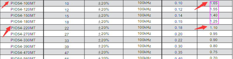 規格確實差不多,難怪我們的老工程師會出錯,但是將規格列出后,就很清晰的看出,原來是飽和電流的問題,李工測試環境的通過電流是1.25A,10uh的飽和電流1.65A是沒問題的,但是22uh貼片功率電感的飽和電流只有1.10A,就是這一點之差,導致無法替換,其實在查過規格書后,我們發現在電流1.25A可以替換型號可以有PIO54的120MT,150MT,180MT都是可以的,可能李工在查規格書時候,錯將180的飽和電流1.25A 看錯行了,當成PIO54-220MT,還好回去又測試一遍,因為是老顧客大家很熟,在溝通后,就用了PIO54-120MT進行了換貨,實屬虛驚一場。