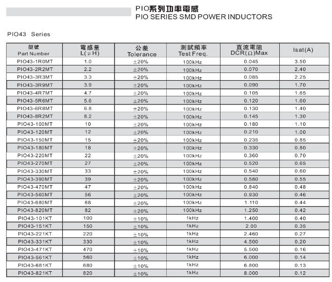 CD43電感最近市場上需求很大,特別是CD43功率電感更是廣泛應用在移動通信,筆記本電腦和LCD電視中,就在昨天我們南山電子接到一位客戶的采購詢問:他們需要一款47uh功率電感,精度±20%,尺寸4.5x4x3mm左右,工作電流不能超過480mA的功率電感,我們技術根據以上條件,幾分鐘便幫他選擇了風華高科的CD43功率電感系列——PIO43-470MT。小編可以在這里幫助大家分析下,為何做這樣的選型規劃最終選型CD43功率電感:首先看尺寸,這個尺寸毫無疑問,就是常見的CD43功率電感,其次看精度 ,如果是精度20%,那么肯定是M系列,其實他們當時說的是40uh到50uh感量都可以,那么毫無疑問47uh功率電感是最常見的且制造工藝較成熟的,再看電流不超過480mA,那么CD43電感——PIO43-470MT完全符合以上選型條件。基于以上客戶需求,南山電子繼續為大家整理出CD43功率電感相關所有型號的規格參數,供大家選型時參考使用。