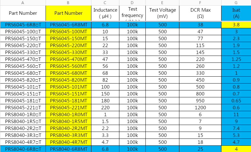 6.8uh電感是比較常見的電感之一,而6.8uh功率電感更是市場上最常用的功率電感之一。其中一體成型屏蔽功率電感6.8uh就很熱門。快年底了,我們南山電子在分析產品出貨情況,發現6.8uh功率電感銷量較大的是PRS8040-6R8MT,說到這款6.8uh功率電感,讓我想到前段時間一個事兒,有一個客戶一直用PRS8040-6R8MT,我們廣東的一位客戶,一直都用PRS8040-6R8MT,也是因為我們6.8uh功率電感前陣子出貨較多,他們又上個月在已經給他們備貨了情況下,新增70K的貨,因為他們是終端,有好幾個技術人員,所以我們就讓他們根據規格書換其他的6.8uh功率電感,他們選擇了PRS6045-6R8MT,我們就發貨了,可是發貨后,他們采購跟我們這里溝通將6045退了回來,原來他們一個新來的技術搞錯了,PRS6045-6R8MT電流不夠,只能等我們調貨原來的6.8uh功率電感。接下來南山半導體就來給你分析下原因,同時告訴大家如何選型: