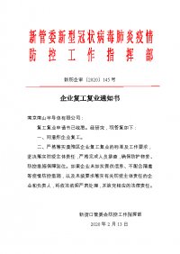 為支持重點客戶的有序生產,南京南山半導體有限公司于2020年2月13日收到南京市新街口管理委員會(新管委)新型冠狀病毒肺炎疫情 防控工作指揮部通知,在2月14日復工。 暫定工作時...