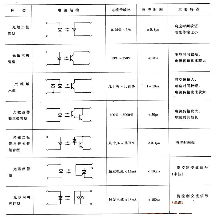 光電耦合器是將發光元件與受光器件組合封裝在同一個密封體內的器件,發光元件、受光器件以及信號處理電路可集成在一塊芯片上。工作時,將電信號加到輸入 端,使發光元件發光,而受光器件在發光元件光輻射的作用下輸出光電流,從而實現電一光一電兩次轉換,通過光進行了輸入端和輸出端之間的穗合。常見的光電糯 合器的電路結構及特性見表所示。