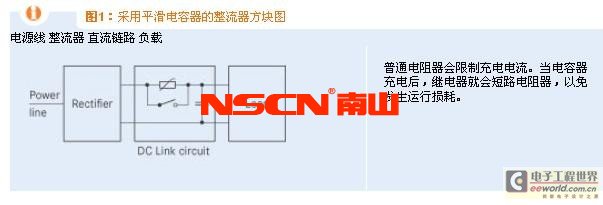 強(qiáng)大的沖擊電流在約150 ms之后使兩個自我防護(hù)式充電電阻器產(chǎn)生高電阻性,進(jìn)而限制電流。而流經(jīng)固定電阻器的電流則僅由極低的電源線電阻進(jìn)行限定,因此固定電阻器中會產(chǎn)生非常高功率的能量轉(zhuǎn)換。