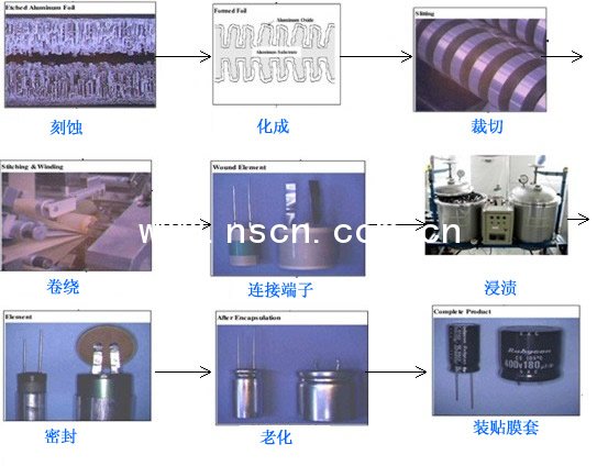 陽極和陰極金屬箔是由高純度的,很薄的只有0.02—0.1mm鋁箔做成的,為了增加盤面積和電容量,與電解液接觸的表面積的增加是通過蝕刻金屬箔去溶解鋁,使整個鋁箔的表面形成一個高密度的網狀的有幾十億個精細微管道的結構。蝕刻技術是牽引在滾筒上的鋁箔通過氯化物溶液,并且在蝕刻溶液和鋁箔之間加AC,DC或AC-&-DC電壓。表面面積對于低壓電容來說可以增加100倍,對于高壓電容來說可以增加20-25倍。