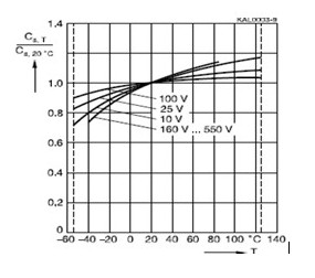 溫度對電解電容的容量有較大影響,溫度降低時,電容粘性增加,這會降低導電性。電解電容的容值隨著溫度的降低而降低。電解電容容量-溫度特性曲線如下圖所示