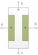 JFET主要由N型半導體、P型半導體、及電極組成。以N溝道JFET為例,理想的JFET的結構為對稱結構。即JFET主體為N型半導體,兩側加入P型半導體。P型半導體上加上電極,成為G(柵極),另外兩側加上電極即為D(漏極)與S(源極)。結構如下圖所示。