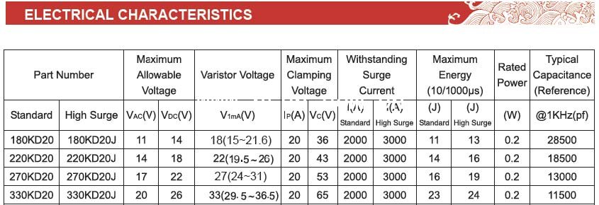 壓敏電阻參數: