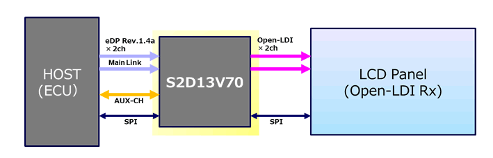 S2D13V70是用于Open LDI橋接器的eDP(rev.1.4a),可通過Open LDI接口實現eDP源與顯示面板之間的連接。它可以通過1通道/ 2通道eDP接收1.62Gbps / 2.7Gbps的數據速率,并將其轉換為2ch開放LDI信令進行傳輸,像素時鐘頻率高達148.5MHz(每1ch)。該規范非常簡單,因此可以輕松地將其插入到現有的系統顯示架構中,而無需進行較少的修改,使其成為現有和未來設計的理想解決方案.S2D13V70還通過了包括AEC-Q100認證和多種功能安全性在內的汽車設計認證。
