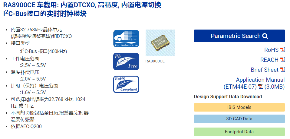今天來給大家講解下用于車載T-BOX等高精度計時的汽車級時鐘模塊RTCRA8900CE。車載實時時鐘芯片RA8900CE內置32.768Khz的晶體,實現年、月、日、星期、小時、分鐘和秒精準計時。RA8900CE滿足AEC-Q200認證,內置溫補功能,保證實時時鐘的穩定可靠,功耗低至0.7uA,可滿足低功耗需求。
