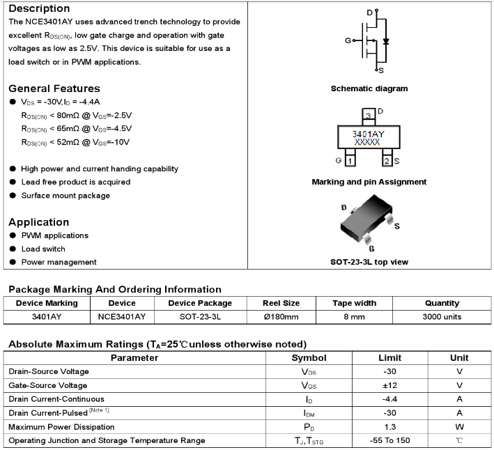 鋰電池保護板一般選用30VMOS管,在這里給大家介紹下新潔能的增強型P溝道MOS管:NCE3401AY那么為何選用新潔能的NCE3401AY呢?南山電子給大家分享下NCE3401AY的規格書,順帶給大家解答: