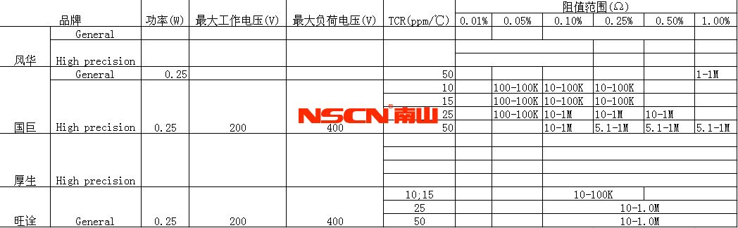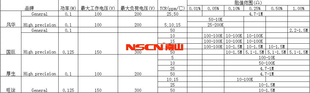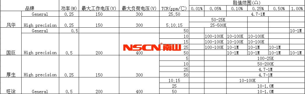幾大電阻廠家的薄膜電阻規格比較