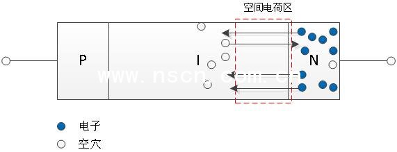 在零偏置電壓的狀態下,I區與N區的界面,由于I層摻雜有少量的P型雜質,所以這時I區與N區間就相當于形成了一個PN結。N區的電子向I區擴散,I區的空穴向N區擴散,I區與P區上就形成了一個空間電荷區。N區的電子濃度很高,所以N區一邊的空間電荷區很薄。I區的摻雜濃度較低,整個空間電荷區的大小幾乎與I層的空間電荷區大小相等。如下圖所示。