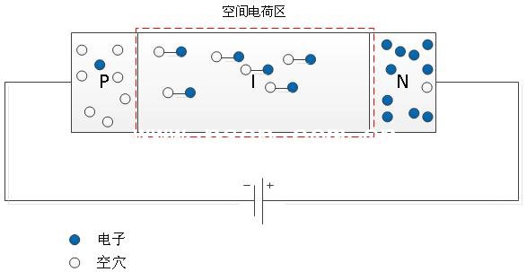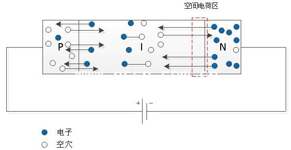 相較之下,P區與I區之間的載流子擴散很小,幾乎可以忽略。所以在零偏置電壓的狀態下,I區與N區間的空間電荷區的載流子幾乎被耗盡,成高阻抗狀態。I區與P區載流子移動很少。整體呈高阻狀態。